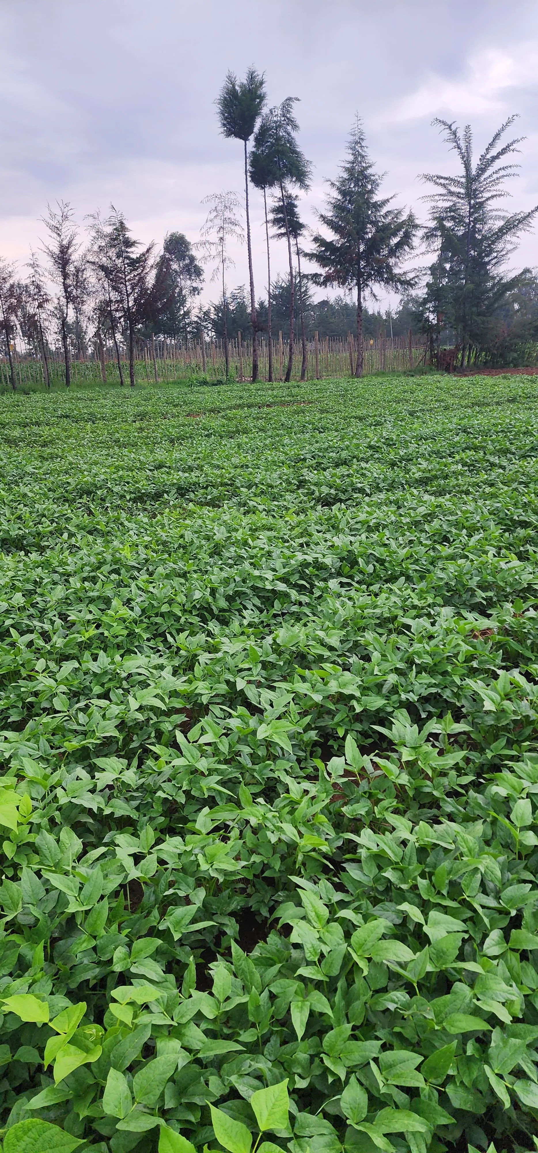Green leafy crops in a farm with tall trees and cloudy sky in the background.